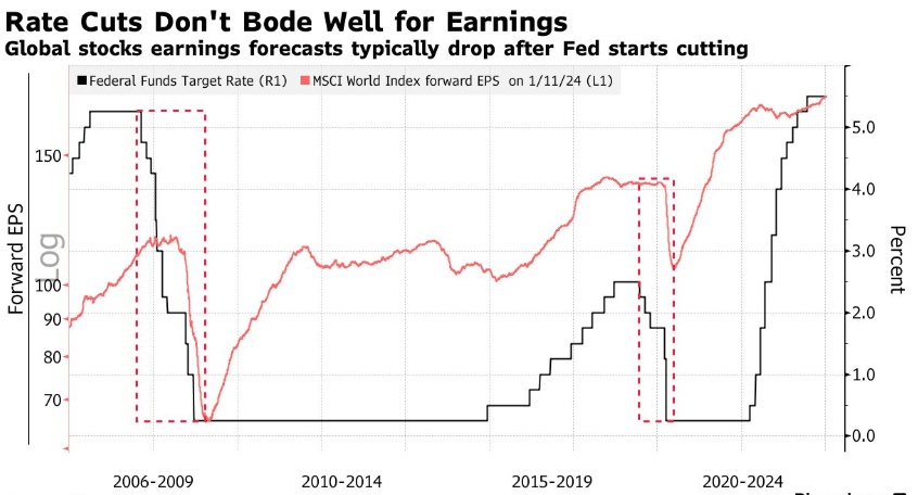 如果以史为鉴,即将到来的降息可能会扭转局面。尽管市场一直热切地预期利率会下降,但这实际上可能对企业盈利并不是一件好事。通常情况下,美联储在经济走向衰退时大幅降息——市场的乐观预测似乎没有考虑到这一点。