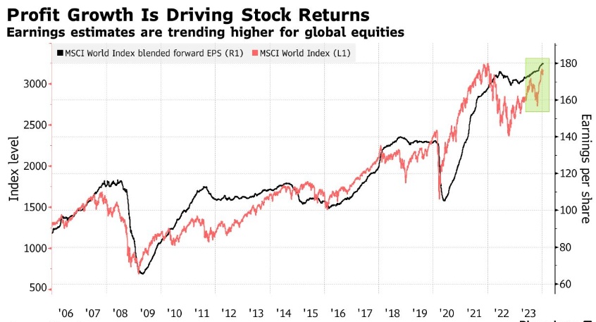 全球股市在过去一年中一直在上涨,在不断增长的盈利预期的支撑下飙升了约16%。利润率徘徊在历史高位附近,分析师们继续上调预期。瑞银集团策略师Gerry Fowler指出,市场受益于低于预期的通胀,这使得债券和股票估值得以扩大。Capital.com资深市场分析师Kyle Rodda表示:"从现在开始,要么盈利预期被下调,股价随之走低,要么降息的影响被消化,股价随之下跌。"