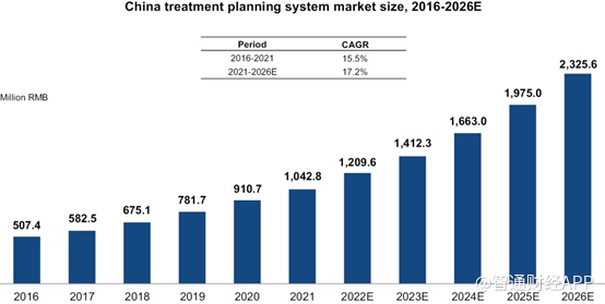 据飞天兆业招股书披露,中国TPS(治疗计划系统)的市场规模从2016年的5.074亿元人民币(约7000万美元)增长到2021年的10.428亿元人民币,复合年增长率为15.5%,预计2026年将达到23.256亿元。