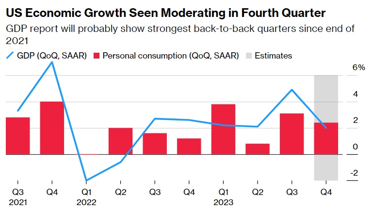智通财经获悉,美国商务部将于周四公布2023年第四季度GDP的初值。相较于2023年三季度,美国第四季度经济增长可能放缓,但经济扩张预计将保持不变。根据预期中值,经济学家预计政府对美国第四季度国内生产总值(GDP)年华季率初值为2%,这将延续第三季度4.9%的增长,为自2021年以来最强劲的连续季度增长。