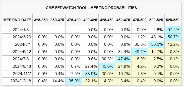 显然,这是一个不同寻常的商业周期,尽管预计美国经济增长将放缓,但它可能仍高于美联储认为与价格稳定相一致的长期增速。自今年年初以来,掉期和期货市场显示,投资者的降息预期有所降温,对3月份首次降息的押注下降,并缩减了全年降息幅度的押注。根据CME美联储观察工具,市场目前预计美联储3月份首次降息的可能性低于50%,而对今年的降息次数预测也从6次下降至5次左右。