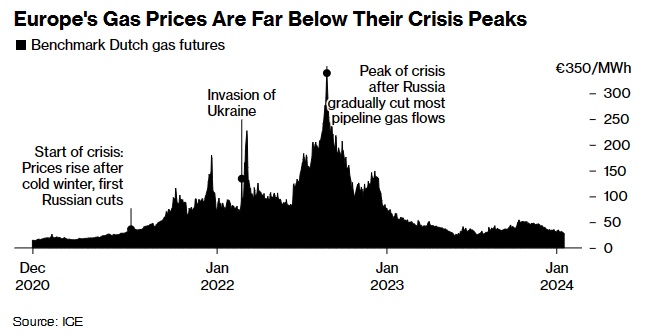 受益于去年创纪录的天然气储备量、以及可再生能源的发展和相对温和的冬季,基准荷兰TTF天然气价格目前仅为28.44欧元/兆瓦时,约为2022年峰值水平的十分之一。疲软的经济也在一定程度上帮助限制欧洲天然气价格,因为德国等主要工业大国的能源需求低迷。这足以提振交易员的信心,即欧元区的基础足够稳定,可以用剩余的天然气度过冬季剩余时间。