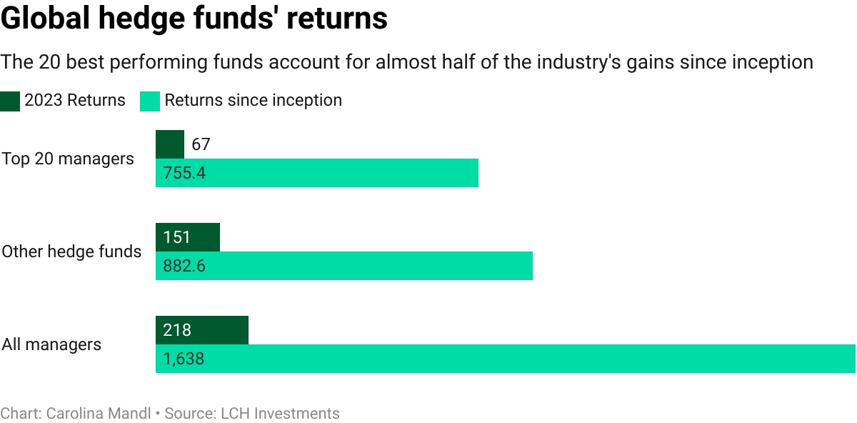 LCH Investments表示,排名前20的对冲基金在去年的平均回报率为10.5%,而整个行业的平均回报率为6.4%。