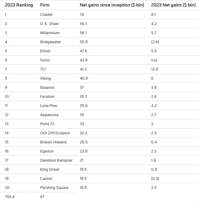 其中,在去年为投资者创造最多收益的是TCI投资基金(TCI Fund Management),该基金在去年创造了129亿美元的收益。排名第二的是创造了81亿美元收益的Citadel。