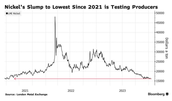 过去两年,在全球经济低迷给金属市场带来压力之际,来自印尼的大量新增供应超过了需求。对于镍来说,电动汽车行业需求增长放缓也是一个不利因素,镍价最近跌至每吨1.6万美元附近,接近2021年以来的最低水平。