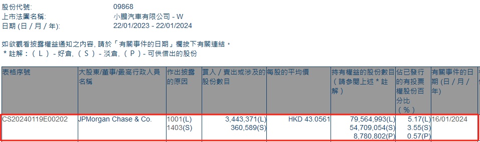 智通财经APP获悉,香港联交所最新资料显示,1月16日,小摩增持小鹏汽车-W(09868)344.3371万股,每股作价43.0561港元,总金额约为1.48亿港元。增持后最新持股数目约为7956.50股,最新持股比例为5.17%。