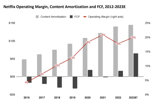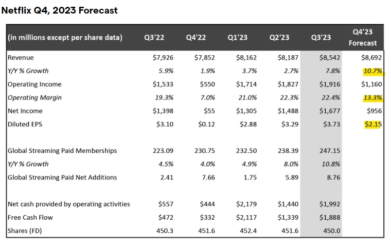这一动态使得收入同比增长7.8%,达到85.4亿美元,季度营业利润率为22.4%,超过市场预期的22.1%,也高于上年同期的19.3%。奈飞的股价在2023年上涨了65.1%,在第三季度报告发布后连续三个月上涨,达到了2022年1月以来的最高点。其次,三季度的自由现金流为18.9亿美元,明显好于预期,部分原因是2023年美国作家协会罢工行动导致内容支出减少。奈飞已将2023年全年自由现金流目标从50亿美元上调至65亿美元。
