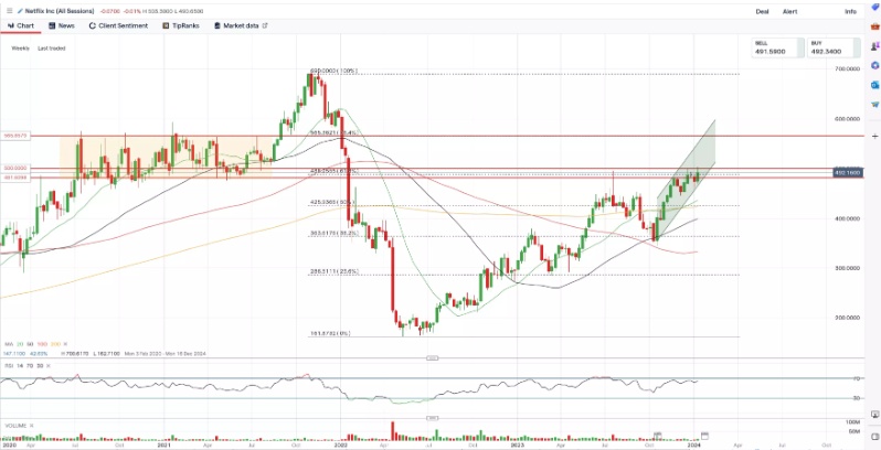 在2023年12月20日未能突破500美元大关后,奈飞的股价近期在高位震荡。打击密码共享策略的影响比市场预期更有效,提振了公司的整体估值,市盈率从2022年底的29.2倍升至47.3倍。