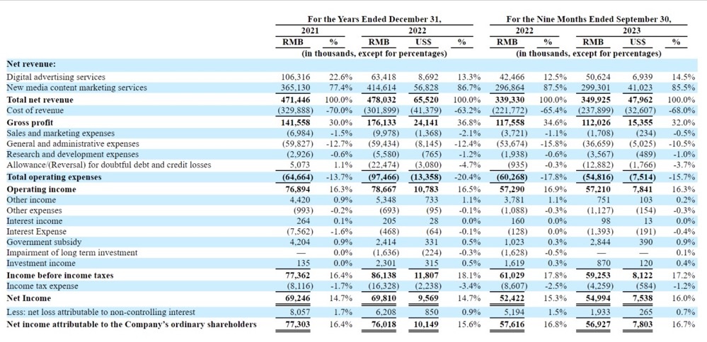 在业务类型上,目前旭航控股所提供营销服务便主要集中在媒体购买和内容创作上。据公司在招股书中提到,其目前主要提供两类营销服务:1.新媒体综合内容营销服务;2.数字广告服务。