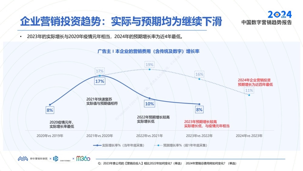 然而,受行业周期及宏观经济周期的影响,目前营销行业的增长也正迎来压力。据秒针营销科学院发布的《2024中国数字营销趋势报告》,疫情以来,企业的营销费用增长率有所下滑,其中2023年实际增长与2020年相当,且预期2024年增长率或可能为近4年最低。