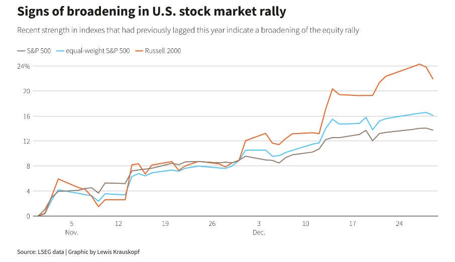 到了2024年,随着全球科技公司在CES大会上各自显露出布局AI技术的决心,这股AI热潮似乎愈发猛烈,继续助力美股涨势,依靠占据标普500指数和纳斯达克100指数的高额权重,七大科技巨头,以及高通和AMD等芯片巨头的强劲涨势——AMD今年以来涨近20%股价已创下历史新高,继续带领美股在2024年高歌猛进,并且涨势已蔓延至美股中小盘市值股。