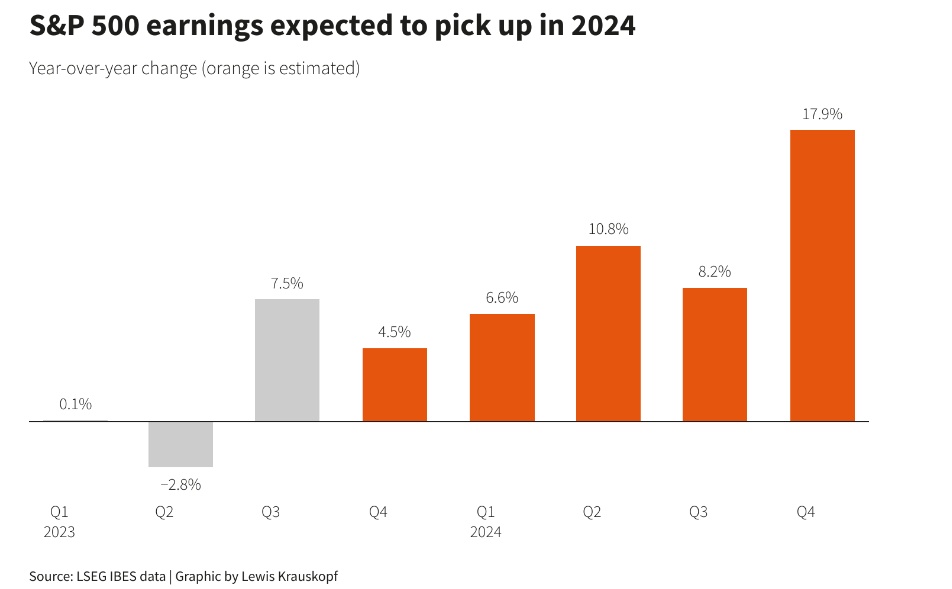业绩预期方面同样具备强大支撑,2024年每股收益预期也极有可能支撑美股进一步走高。尽管整体成分股利润增长乏力,但标普500指数在 2023 年仍录得强劲上涨,全年的整体每股收益大约增长 2.8%。但是华尔街分析师们普遍预计 2024 年标普500指数成分股整体每股收益会有更强劲的表现,预计全年盈利将实现增长 10.9%。