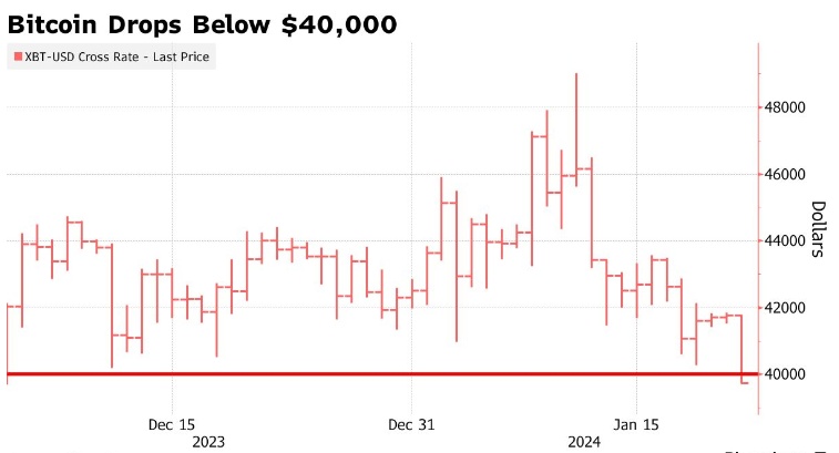 智通财经获悉,比特币自去年12月初以来首次跌破4万美元,原因是投资者对直接投资比特币ETF的热情消退。截至发稿,比特币下跌5.3%至39556美元。这是去年12月4日以来的最低水平。以太坊和Solana等规模较小的数字代币分别下跌了6.7%和9.3%。