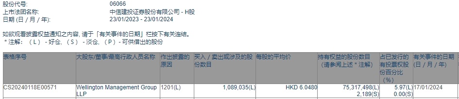 智通财经APP获悉,香港联交所最新资料显示,1月17日,Wellington Management Group LLP减持中信建投证券(06066)108.9035万股,每股作价6.0480港元,总金额约为658.65万港元。减持后最新持股数目约为7531.75万股,最新持股比例为5.97%。