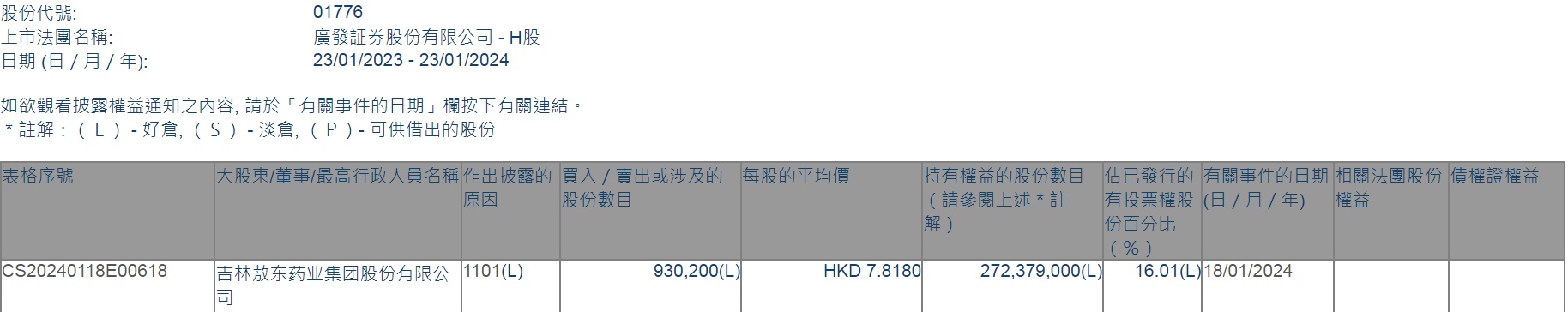 智通财经APP获悉,香港联交所最新资料显示,1月18日,吉林敖东药业集团股份有限公司增持广发证券(01776)93.02万股,每股作价7.818港元,总金额约为727.23万港元。增持后最新持股数目约为2.72亿股,最新持股比例为16.01%。