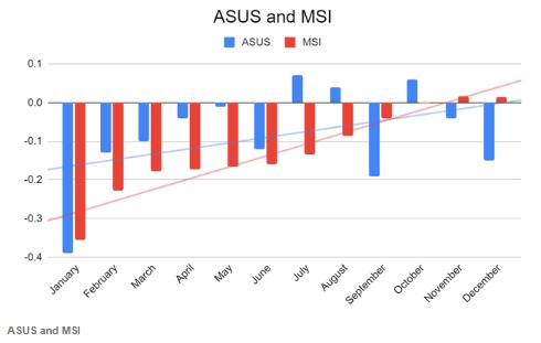 消费电子产品制造商华硕(Asus)和微星(MSI)每月都会公布收入数据。这些公司向代表各种消费电子产品的笔记本电脑销售计算机零件和计算机外围设备,如下图所示,整个2023年,每月收入趋势一直在稳步增长。两家公司的趋势线斜率的大小不同,但正趋势线斜率反映了消费电子产品需求的复苏。