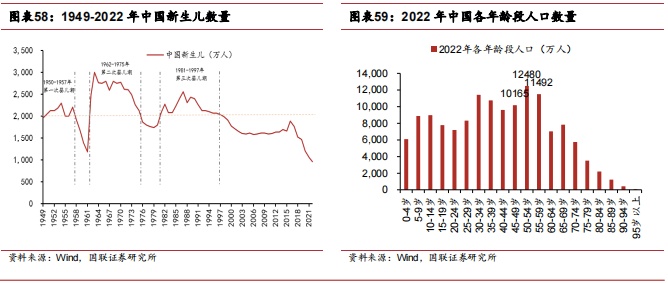 回溯我国建国来的出生人口变动情况,以2000万人新生儿为分界线,我国建国以来共经历了三次婴儿潮,其中1962-1975年是三次婴儿潮中新生人口最多的时间段,这部分人口对应到2022年为47-60岁,是中国各年龄段人口分布中数量最多的人群,将逐步自2027年开始步入65岁老龄阶段。