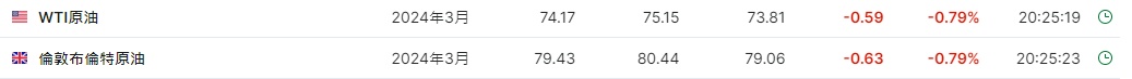 3. 截至发稿,WTI原油跌0.79%,报74.17美元/桶。布伦特原油跌0.79%,报79.43美元/桶。