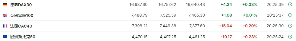 2. 截至发稿,德国DAX指数涨0.03%,英国富时100指数涨0.01%,法国CAC40指数跌0.20%,欧洲斯托克50指数跌0.23%。