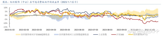 回顾2023年,服装行业企稳回升,带动服装板块也“水涨船高”。据太平洋证券统计,2023年纺织服装板块相对于上证和沪深300指数均获得超额收益,其中纺织服饰板块在可选消费板块中涨幅居中。