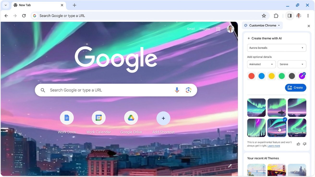 另一个重要更新是引入的人工智能驱动的主题创建器。利用Chrome浏览器内置的文本到图像的扩散模型,用户可以基于主题、情绪、视觉风格和颜色生成自定义浏览器主题。这一功能可通过浏览器侧边栏中的“用AI创建”主题选项访问,为用户提供了无限的个性化设计可能性,从宁静风景到生动抽象图案均在创意范围之内。