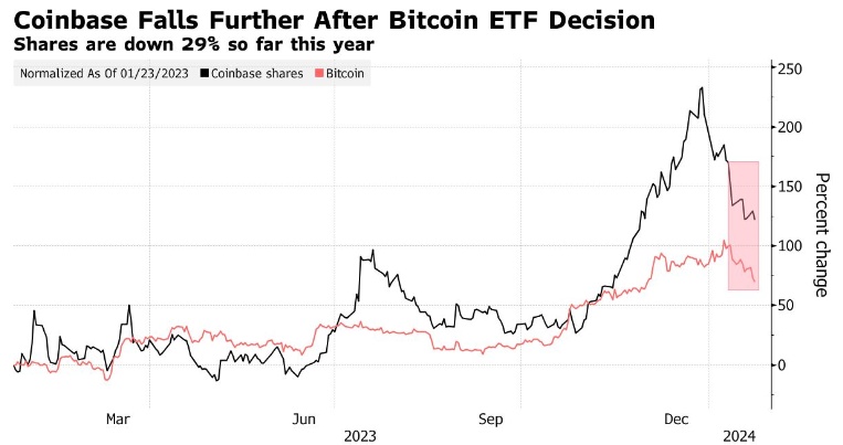截至2023年年底,Coinbase的股价涨幅接近400%,跟随比特币在年底的飙升。然而,在美国金融监管机构最近批准现货比特币ETF之后,市场观察人士一直在想,与加密相关的股票是否能够继续保持强劲的涨势。今年迄今为止,Coinbase股价下跌了29%,而比特币下跌了约6.8%,最近的交易价格低于4万美元。