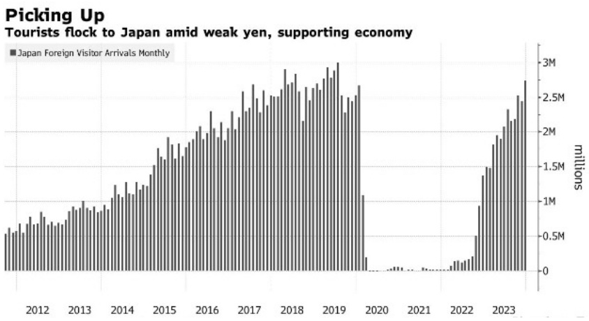 对于日本经济来说,大量游客返回日本是一个积极的发展,日本经济去年以自2020年夏季疫情最严重以来最急剧的速度萎缩。日元贬值帮助提高了游客的消费能力,使日本成为一个更实惠的旅游目的地。去年美元兑日元的平均汇率约为140.5。