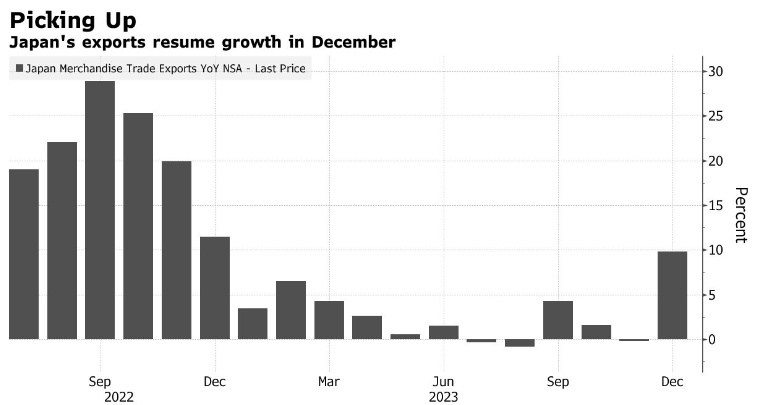智通财经获悉,日本12月出口强劲回升,对美出口以两位数增长,对中国出口13个月来首次增长。日本财政部周三公布,12月份商品出口同比增长9.8%,高于预期的9.1%,创下一年来最大增幅,扭转了上月下降0.2%的局面。这些数据将提振日本经济在10月至12月当季恢复增长的前景。