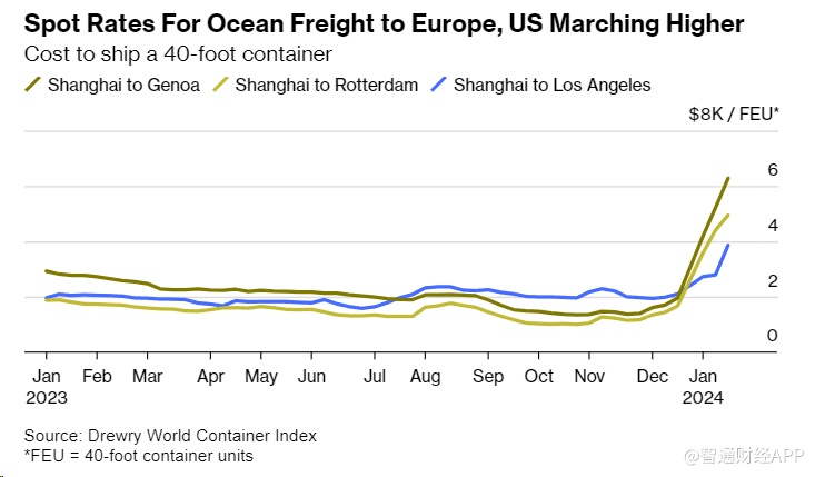 Bloomberg Economics表示,航运成本带来的上行风险可能会为央行推迟降息提供另一个理由。摩根大通的经济学家预计,如果航运危机持续下去,今年上半年全球商品通胀将上升0.7个百分点。
