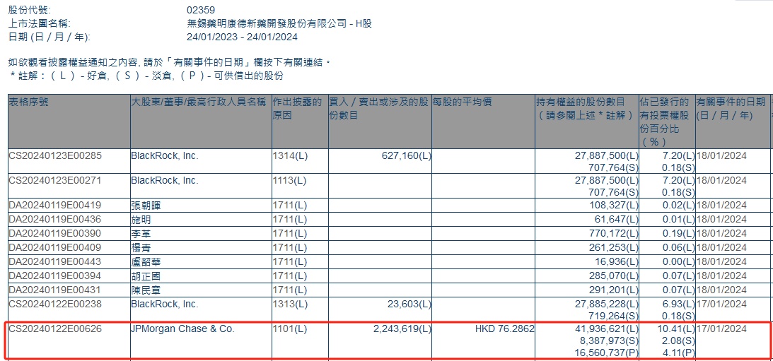 智通财经APP获悉,香港联交所最新资料显示,1月17日,小摩增持药明康德(02359)224.3619万股,每股作价76.2862港元,总金额约为1.71亿港元。增持后最新持股数目约为4193.66万股,最新持股比例为10.41%。