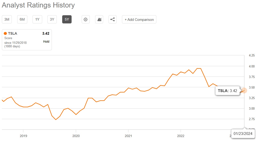 Seeking Alpha统计数据显示,特斯拉的分析师评级分数不断下滑,很大程度上能够反映出华尔街对这家电动汽车领导者盈利前景的不安情绪。目前特斯拉Analyst Ratings仅仅为3.42(满分为5分,相比之下英伟达与微软这一分数接近5),反映出越来越多的分析师将特斯拉评级由“买入”下调至“谨慎持有”或者“卖出”。