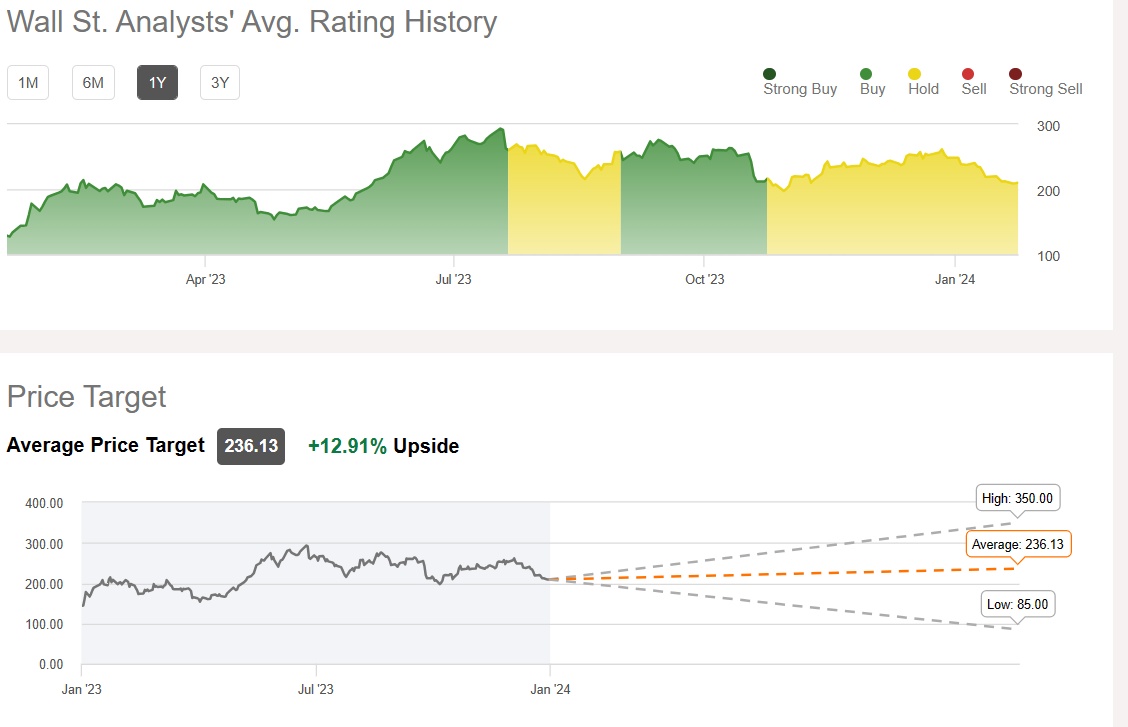 股票评级和股价目标价预期方面, Seeking Alpha汇编的预期数据显示,华尔街分析师们予以特斯拉的共识评级已经由此前的“买入”转变为“持有”,平均目标价已经下滑至236.13美元,最低目标价则仅仅为85美元。