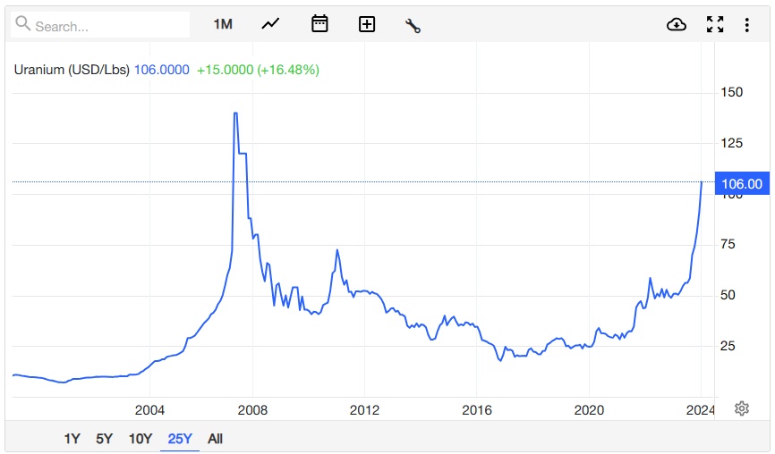 智通财经APP获悉,在供需格局持续趋紧的情况下,国际铀价自2023年下半年以来一直保持迅猛涨势。数据显示,截至发稿,国际铀价涨至106美元/磅,创下2007年以来的最高水平;在过去的12个月里,国际铀价的涨幅高达117%。