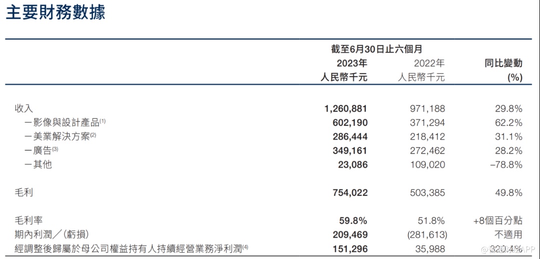 财报显示,截至2023年上半年,美图公司月活跃用户总数为2.47亿,其中海外月活跃用户数约7368.8万。截至2023年6月,公司所有影像与设计产品的付费订阅用户总人数约为720万,占月活跃用户基数的订阅率约为2.9%,而一年前则为2.0%。公司称,影像与设计产品业务绝大多数的收入模式是VIP订阅。于2023年第二季度,由于公司持续实施体系化的AIGC策略,该业务的收入加速增长。盈利能方面,2023年上半年,美图的毛利率达到59.8%同比提升8个百分点,主要由于影像与设计产品的带动。