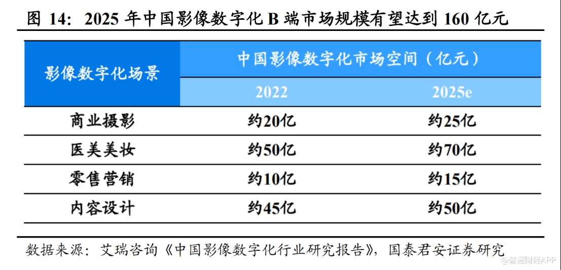 另一方面,就影像数字化B端市场而言,可能面临“僧多粥少”的局面。据艾瑞咨询发布的《中国影像数字化行业研究报告》,2022年中国影像数字化B端市场规模为125亿元,预计到2025年市场规模将提升至160亿元,期间年均复合约8.5%。美图在这个市场中面临着剪映、轻颜、天天P图、快影、一甜相机、秒剪等诸多互联网大厂旗下应用的竞争。