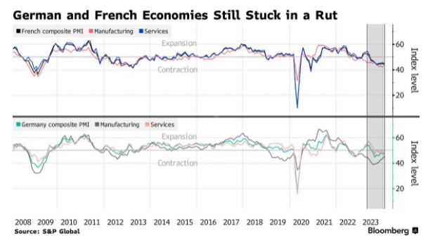 德国1月份PMI数据整体仍然黯淡,综合PMI初值为47.1。同样地,法国今年的开局也非常艰难,综合PMI初值为44.2。