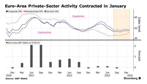 标普全球的商业调查显示,去年下半年这两个国家的经济低迷在1月份继续以略快的速度加深,不及此前经济学家预期的情况将有所改善。制造业和服务业均未能恢复到增长区间。