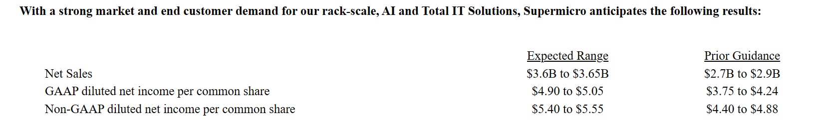 日前,超微电脑发布公告称,公司将上调对2024财年(截至6月30日止12个月)第二季度的业绩指引。其中,预计第二季度的净销售额为36亿至36.5亿美元,高于公司此前预测的27亿至29亿美元;摊薄后每股收益预计为4.90至5.05美元,高于公司此前预测的3.75至4.24美元;调整后摊薄每股收益预计为5.40至5.55美元,高于公司此前预计的4.40至4.88美元。
