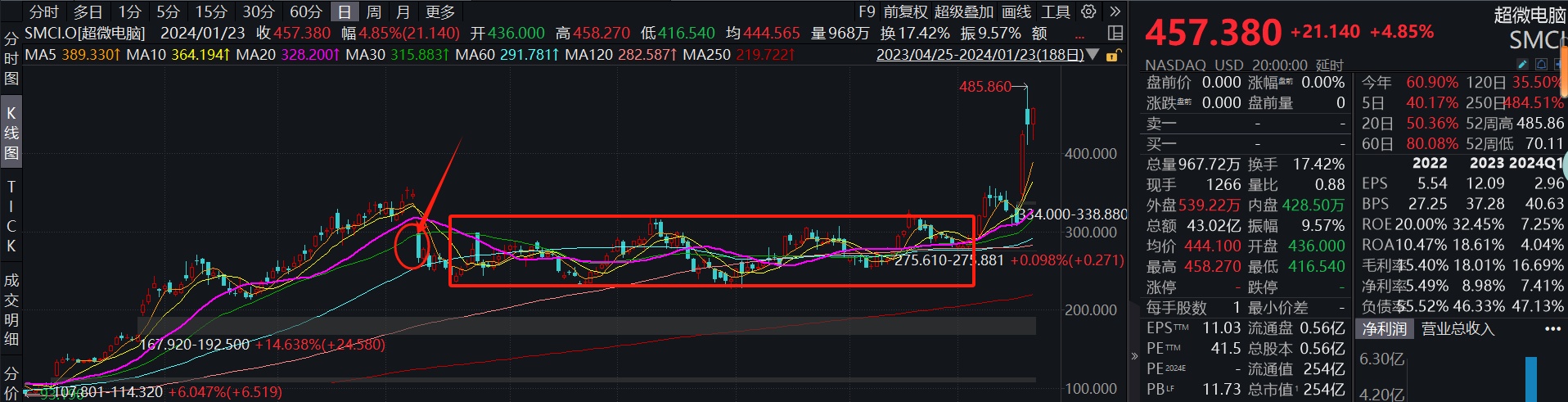 美股以英伟达(NVDA.US)、超威半导体(AMD.US)等为代表的AI核心股已进入了主升行情,超微电脑(SMCI.US)在一则业绩指引的催化下也迎来了股价的大爆发。