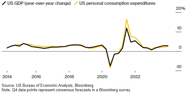 智通财经APP获悉,近期美国零售销售报告出炉后,经济预测者发现自己处于一个熟悉的位置:不断提高对国内生产总值(GDP)的预期。美国经济分析局周四发布的季度数据预计将显示,2023年最后三个月美国经济以2%的年增长率扩张,其中家庭消费增长2.5%。