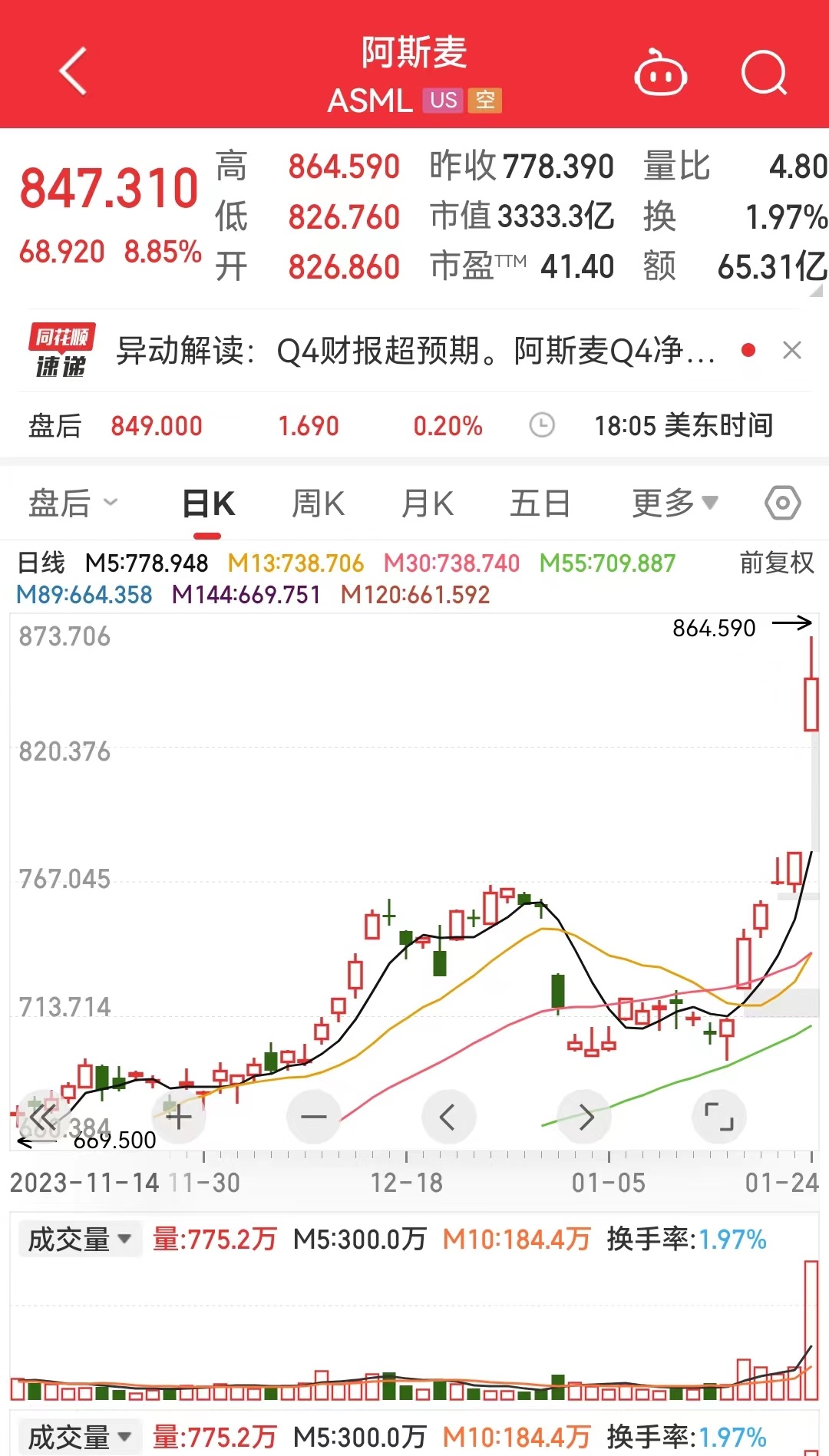 智通财经APP获悉,1月24日,光刻机巨头阿斯麦(ASML.US)发布了2023年第四季度及全年财报。得益于对中国芯片制造设备的强劲销售表现,该公司营收和净利润均超预期。2023 年是半导体下行周期,台积电等晶圆厂减少了资本开支,阿斯麦却实现了逆势增长。24日盘中,阿斯麦股价一度大涨11%,逼近2021年9月底的历史高点。