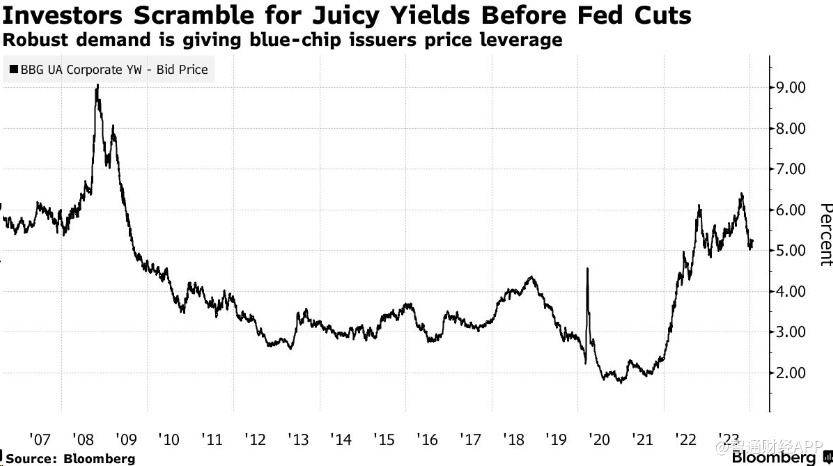 越来越多的投资者猜测美联储将在今年某个时候实施货币宽松政策。不过,在降息时机不确定的情况下,投资者已经开始大量买入新的高评级债券,因为高评级债券的存续期通常都很长,如果利率开始下降,这类债券将成为颇具吸引力的投资对象。