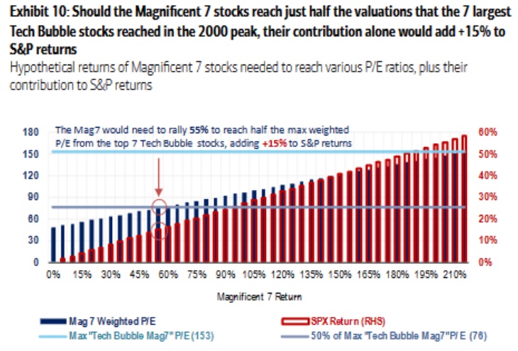 但与1990年代末的泡沫时代相比,美股估值仍然相对温和。美国银行策略师Benjamin Bowler等人最近的一项分析显示,如果它们要达到当时七大科技股的峰值市盈率的一半,那么今天所谓的“壮丽七雄”就必须分别上涨55%。在其他条件相同的情况下,这意味着标普500指数将上涨15%。