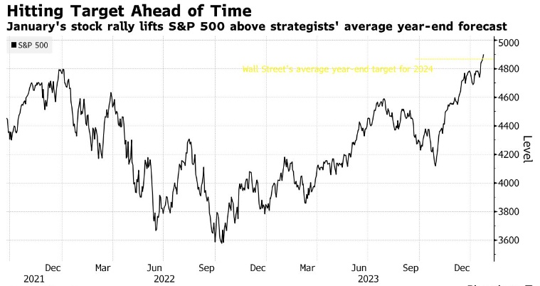 进入2024年一个月不到,标普500指数就已经超过了华尔街对该指数今年收盘点位的共识预期。受英伟达(NVDA.US)和微软(MSFT.US)股价上涨的推动,标普500指数周三再度走高。对美联储可能降息以及企业盈利反弹的乐观情绪推动了股市的最新上涨。该基准股指连续五个交易日上涨,刚超过4867点,这是分析师对2024年该指数收盘点位的共识预期。