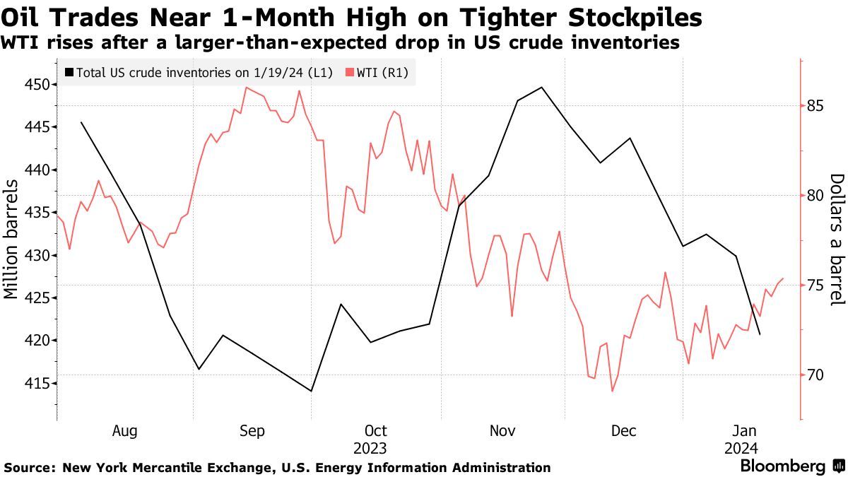 智通财经APP获悉,油价升至近一个月高点,原因是美国原油库存降幅远超预期,以及中国推出了更多刺激措施。周三盘中交易中,WTI原油价格升至去年12月26日以来的最高水平,至每桶75美元上方,布伦特原油价格则保持在每桶80美元上方。