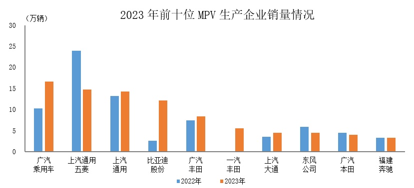 据中国汽车工业协会统计分析,2023年,销量排名前十位的MPV生产企业共销售88.1万辆,占MPV销售总量的79.9%。在上述十家企业中,与上一年度相比,广汽乘用车、上汽通用、比亚迪股份(01211)、广汽丰田、一汽丰田和上汽大通销量均呈增长,其他企业销量呈不同程度下降。