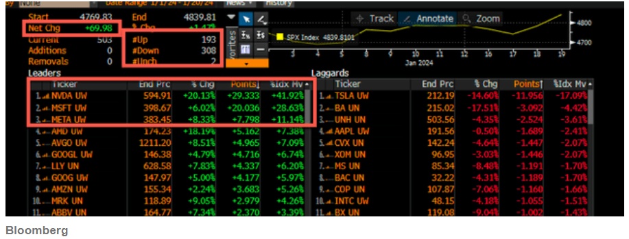 Kramer表示,标普500指数今年以来上涨了69.98点,涨幅1.47%。其中,英伟达贡献了29.3点,微软贡献20.0点,Meta贡献7.8点。这意味着,在标普500指数上涨的约70点中,有57.1点(即80%)来自三只股票。