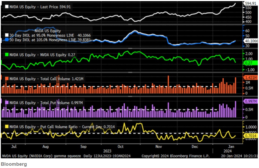 英伟达也显示出伽马挤压的迹象,即看跌/看涨比率处于历史区间的低端,隐含波动率上升并向看涨方倾斜,且股价飙升。伽马挤压是一种自我强化的行为,投资者购买价外看涨期权,这导致做市商通过买入股票来对冲标的,从而推高股价。