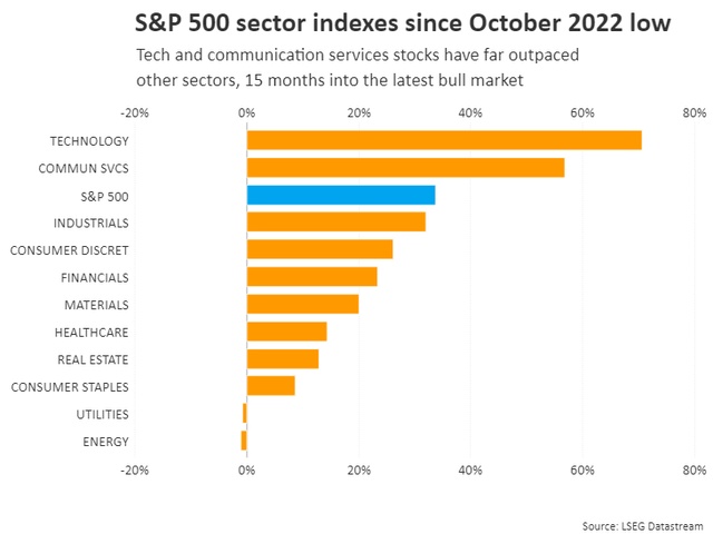 此外,剔除美股“七巨头”之后的等权重标普500指数的市盈率接近16倍,远低于标普500指数20倍的市盈率。这也让市场上关于股票在当前水平上过于昂贵而不能买入的观点变得有些无力。因此,对投资者来说,这轮牛市似乎有很多机会。而对大多数股票来说,这轮牛市可能才刚刚开始。