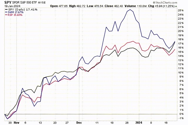 不过,情况在去年10月之后发生了巨大变化。随着几只大型科技股之外的其他股票也出现反弹,市场广度显著提高。事实上,自去年10月的低点以来,罗素2000指数的表现一直好于标普500指数,而等权重的标普500指数的表现也不相上下。